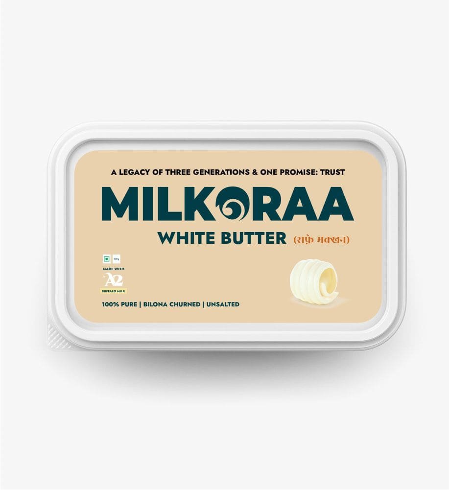 Milkoraa Butter is made using the traditional Bilona method, where fresh A2 milk from desi buffalo is boiled, cultured into curd, and then hand-churned to extract pure white butter. This slow, natural process preserves the rich taste, aroma, and nutrition that commercial butters often lack. Free from additives and made in small batches, Milkoraa Butter brings back the wholesome goodness of real, farm-fresh butter—just the way it was meant to be.